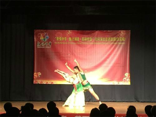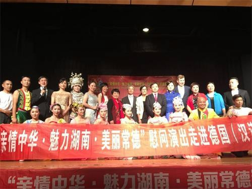 德国当地时间8月29日晚,“亲情中华·魅力湖南·美丽常德”文化交流团来到常德的友好合作城市德国汉诺威市,与汉诺威市政府、汉诺威常德联谊会联合在汉诺威市Freizeitheim文化宫为当地华人华侨和市民送上了一台精彩的文艺演出。文化交流代表团团长、湖南省侨联副主席孙民生,副团长、常德市政协副主席傅绍平和德国汉诺威市副市长卡阿马·瑞克、中国驻汉堡总领事馆副总领事楼了凡分别致辞。常德市侨联海外顾问、德国汉诺威常德联谊会会长夏柏兰女士和副会长施耐德先生主持仪式。德国汉诺威市政府官员、在汉诺威的华侨华人、留学生,在常德德国小镇投资的德国企业家们和各界友人共300多人观看了整场演出。 演出现场,一曲欢快热情的《茉莉花》拉开了演出的序幕。国家非物质文化遗产汉剧高腔是湖南常德独有的地方剧种,由中国梅花奖获得者、国家一级演员彭玲演唱的汉剧《穆桂英打围》选段、常德姑娘表演的丝弦《生在潇湘多自豪》等极具地方特色的节目,令现场观众目不转睛,屏息观看,不时报以热烈掌声。尤其是湘籍知名小品演员孟祥鑫、郭习军表演的哑剧小品《擦镜子》,夸张的肢体语言和幽默滑稽搞笑的动作,引得全场观众捧腹大笑;将中国功夫和歌唱融于一体的《好汉歌》,将整场演出推向了新的高潮。整台演出共12个节目,演出持续近90分钟。中华雅韵,潇湘花鼓,唱不尽中华情,唱不尽祖国爱,唱不尽同胞亲,演出在《中国美》歌舞中圆满落下幄幕。 们和各界友人共300多人观看了整场演出。